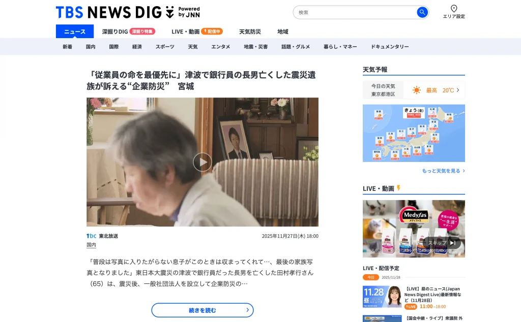 東日本大震災の津波で銀行員だった長男を亡くした田村孝行さん(65)は、震災後、一般社団法人を設立して企業防災の大切さを訴えています。