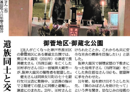 128人が亡くなった神戸市長田区 の御菅地区にある御蔵北公園では、 東日本大震災(2011年)の津波で長男健太さん(当時25歳)を亡くした 田村孝行さん(65)=宮城県大崎市=が、阪神大震災の犠牲者を慰霊した。 記事全文 […]